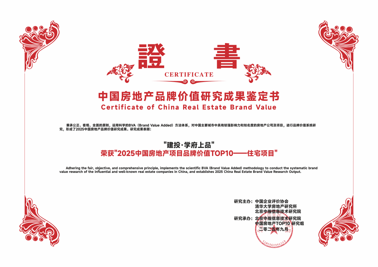 9月11日,由中国企业评价协会、清华大学房地产研究所、北京中指信息技术研究院主办的“2025中国房地产品牌价值研究成果发布会暨第二十二届中国房地产品牌发展高峰论坛”在北京隆重召开。由城市运营集团开发的建投·学府上品项目凭借在住宅领域的卓越表现与创新实践,荣获“2025中国房地产项目品牌价值TOP10——住宅项目”奖项,再次彰显行业领先的品牌实力与市场影响力。