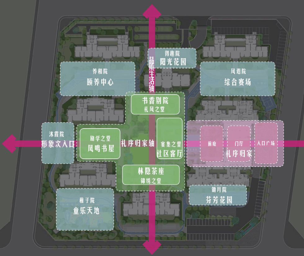 项目传承凤鸣书院的空间结构和文人雅趣,呈“两轴-四堂-六院” 串联整个空间序列,打造多层庭院递进的景观空间结构,形成一处兼具人文内涵与时尚居住的现代社区,营造书香浸润的独特景观体验。
