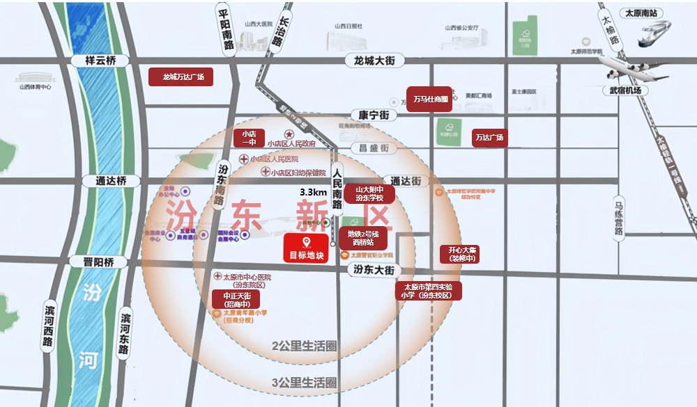 该地块为汾东商务区规划建设的核心承载区,周边基础设施及公共服务配套日趋成熟。北京大学第一医院太原医院、山大附中汾东学校、太原市第四实验小学等优质医疗、教育资源相继落地;汾河生态廊道、昌盛万达广场环伺周边,生态休闲与潮流商业资源汇聚,区域产城融合示范区发展格局已初步显现。汾东商务区涉宅用地已连续三年断供,本次出让宗地集地铁口、主干道交汇、产城双区赋能等优势于一体,具备不可复制的稀缺区位属性。