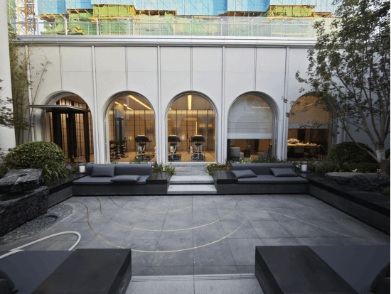 建投·誉河院和建投·津樾府项目在铺装施工中,全面执行“多重对缝”工艺标准,通过“三维放线定位-模块化预排版-渐进式精调”实现毫米级精度控制。施工阶段采用激光投线仪建立空间坐标系,弹出中轴线为基准线,同步校准外墙、单元门、地面铺装的分割线;并通过“吊线-靠尺-塞尺”三重校验,确保立面对缝通线、地面对缝贯通、天地对缝呼应,最终实现“多重对缝”整体,视觉延伸无缝、触觉平整如镜的精工效果。