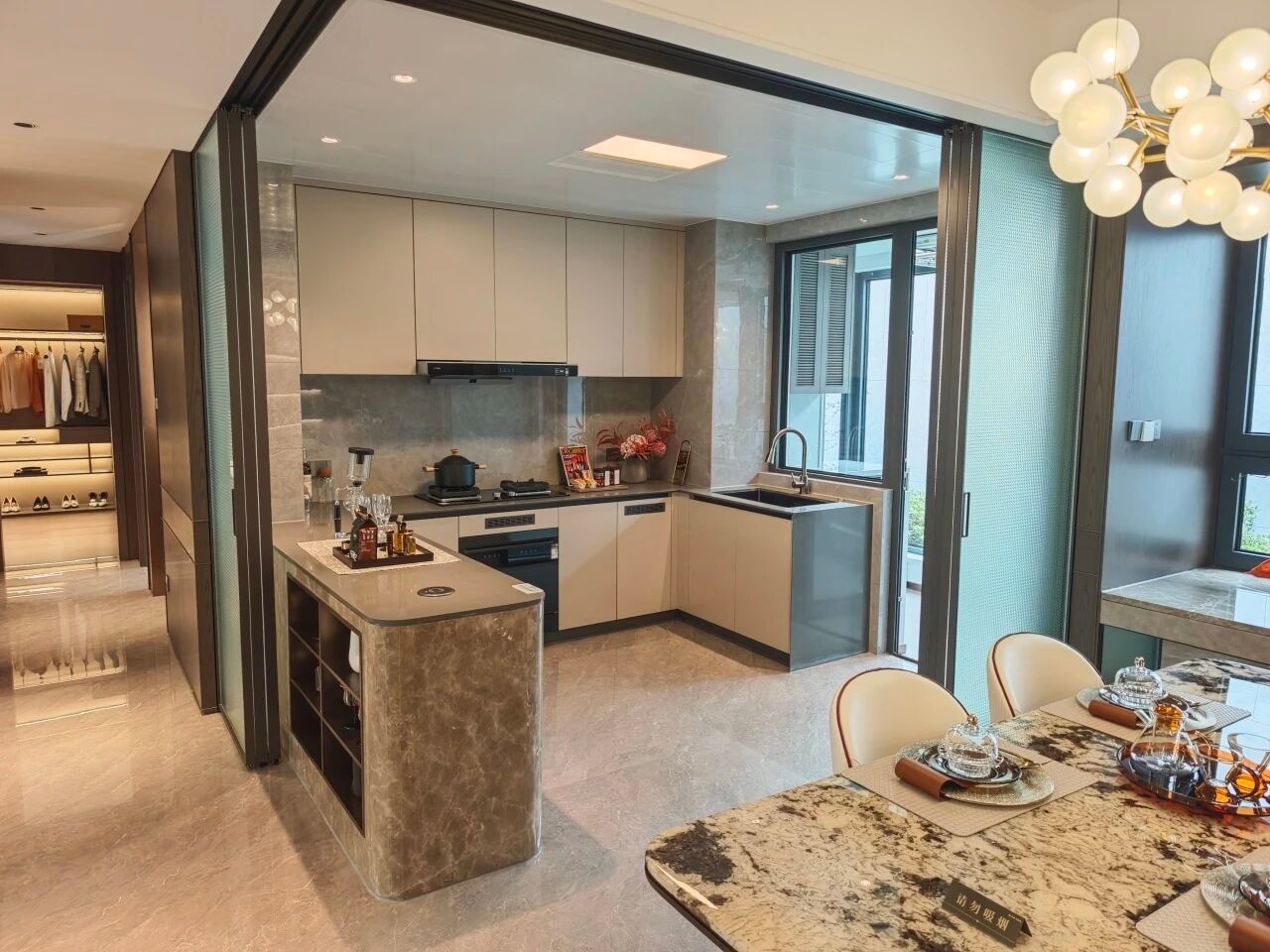 建投·晋和府项目厨房各功能区形成流畅动线,减少不必要的来回走动和转身。家电采用嵌入式与一体化设计,与橱柜平齐,避免磕碰。灶台和排烟系统不仅提升吸油烟效果,同时释放吊柜空间,提升空间使用效率。餐厅吊柜下方、操作台正上方等处嵌入LED灯带,实现无影操作,保障视觉清晰与安全。水槽为大单槽+沥水盆,轻松容纳大锅具,配合可移动的沥水架和砧板,灵活实用。抽拉式龙头可无死角清洁水槽,提升台盆作业的便捷性。厨房台面采用抗菌、易清洁材质,延长使用寿命。