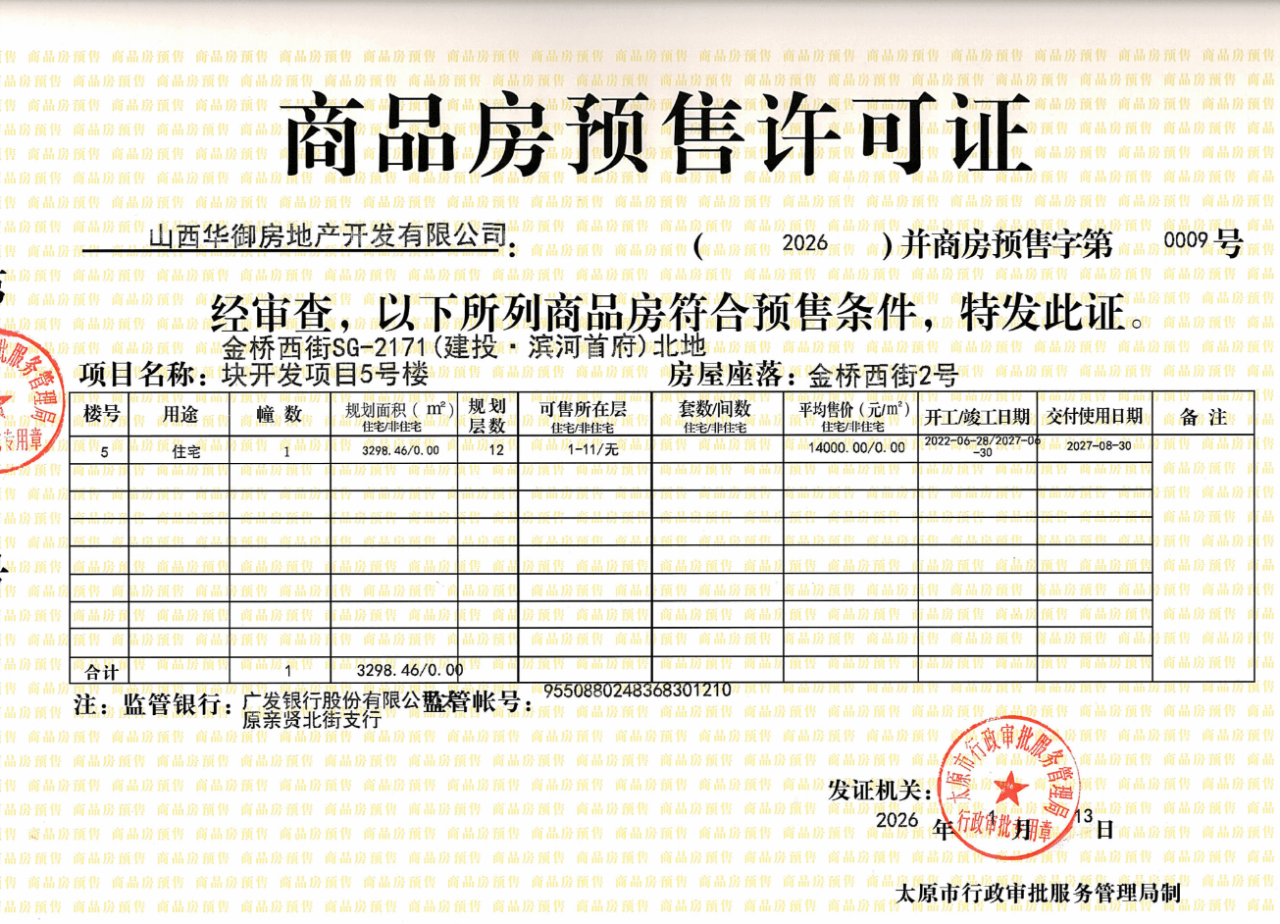 1月13日,建投·滨河首府北区「和府」5#楼正式取得商品房预售许可证。作为汾河畔静奢低密洋房社区,项目以不可复制的双水系生态资源,再度敬献理想生活的品质人居。