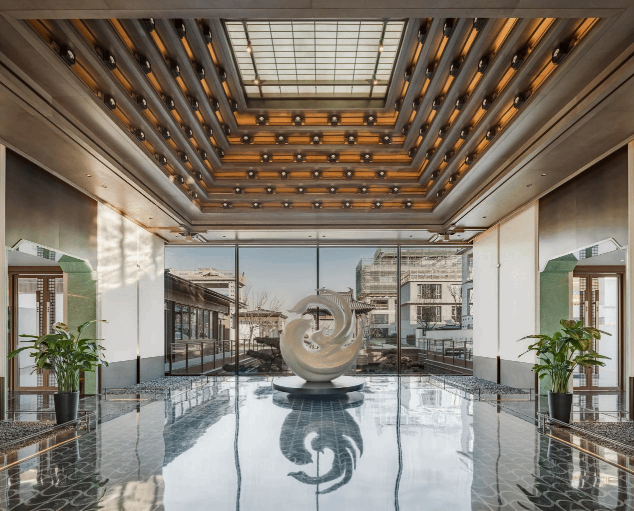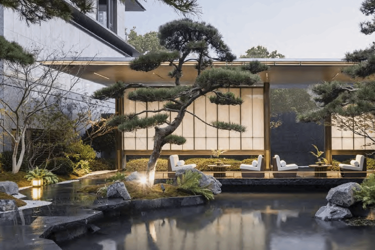 项目设计遵循轴线对称原则,运用水景、木质元素打造三进礼序空间:一进以白墙灰瓦、飞檐斗拱等构建入口空间;二进还原曲水流觞意境,打造特色休闲区域;三进规划 1200 平方米社交空间,设置书坊、茶坊、亲子、健身、私宴等功能区,满足多元生活需求。